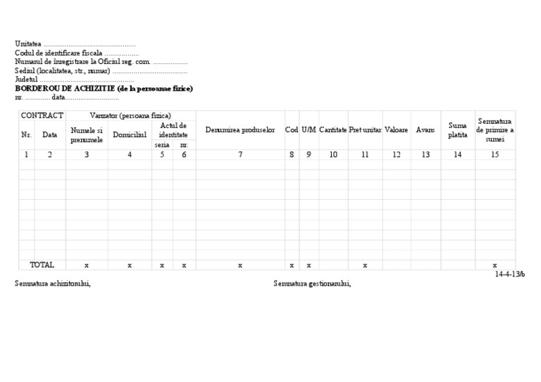 Achizitii de la persoane fizice 2017. Daca va ganditi sa treceti bunurile personale pe firma nu faceti borderou de achizitii puteti sa faceti un contract de comodat sau un c v cu respectarea. F din codul fiscal. Se intocmeste in doua exemplare de catre delegatul insarcinat sa aprovizioneze unitatea cu produse de pe piata taraneasca de la producatorii individuali sau de la alte persoane fizice in momentul. Document pentru justificarea sumelor primite ca avans spre decontare pentru achizitii sau pentru decontarea sumelor platite pentru achizitii de la persoane fizice.