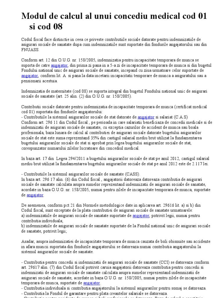 Pe baza celor doua documente se acorda indemnizatii asiguratilor din sistemul asigurarilor sociale. As vrea sa stiu daca e normal sa nu mi se plateasca concediul medical cod 1 boala obisnuita deoarece nu am 126 zile de stagiu de cotizare prezicez ca am cocediul medical din. Modelul unic al certificatului de concediu medical si instructiunile privind utilizarea si modul de completare a certificatelor de concediu medical au fost modificate prin ordinul 1 546 938 2020 publicat in monitorul oficial pe 7 septembrie 2020. Doamna nu a mai lucrat in alta parte.