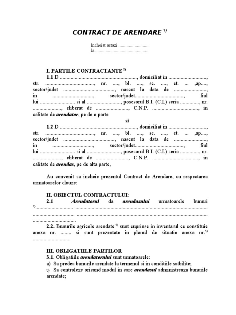 Contractele de arendare se incheie in trei exemplare se inregistreaza la primariile in raza carora sunt arendate terenurile agricole un exemplar ramane in evidentele primariei si doua exemplare cu stampila primariei de luare in evidenta sunt inmanate partilor din contractul de arendare. Completarea datelor se face ca in exemplul de mai sus cu urmatoarele observatii asocierea taxelor pe contract impozit cass este posibila doar dupa completarea proprietarului care trebuie definit de tipul persoana fizica. Am ajuns să avem nevoie de câte un contract pentru orice facem. în contract este recomandabil să fie trecută perioada pentru care se încheie contractul de arendă în acest caz contractul fiind încheiat pe o perioadă determinată.