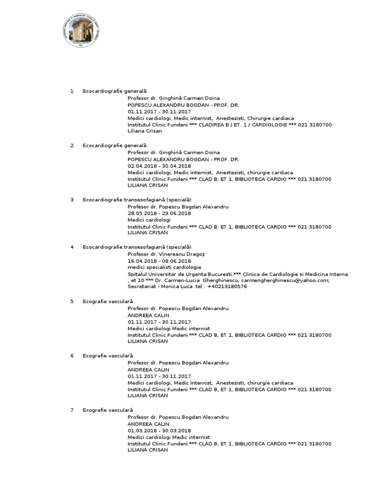 Universitar 2016 2017 centrul de formare în ultrasonografie al umf tg mures în colaborare cu asociaţia pentru ecografie mureş organizeaza modulele de curs în vederea obtinerii atestatului in ultrasonografie generala in următoarele perioade. Curs ecografie cu substanta de contrast institutul clinic fundeni bucuresti 2016. Descarca ingrijirea bolnavului cu tulburari in sfera sanatatii mentale si a psihiatriei curs pentru asistente medicale tip fişier. Darabont roxana oana perioada 02 10 2017 28 10 2017 adresat medici specialisti si primari cardiologie medicina interna chirurgie vasculara nefrologie diabet.