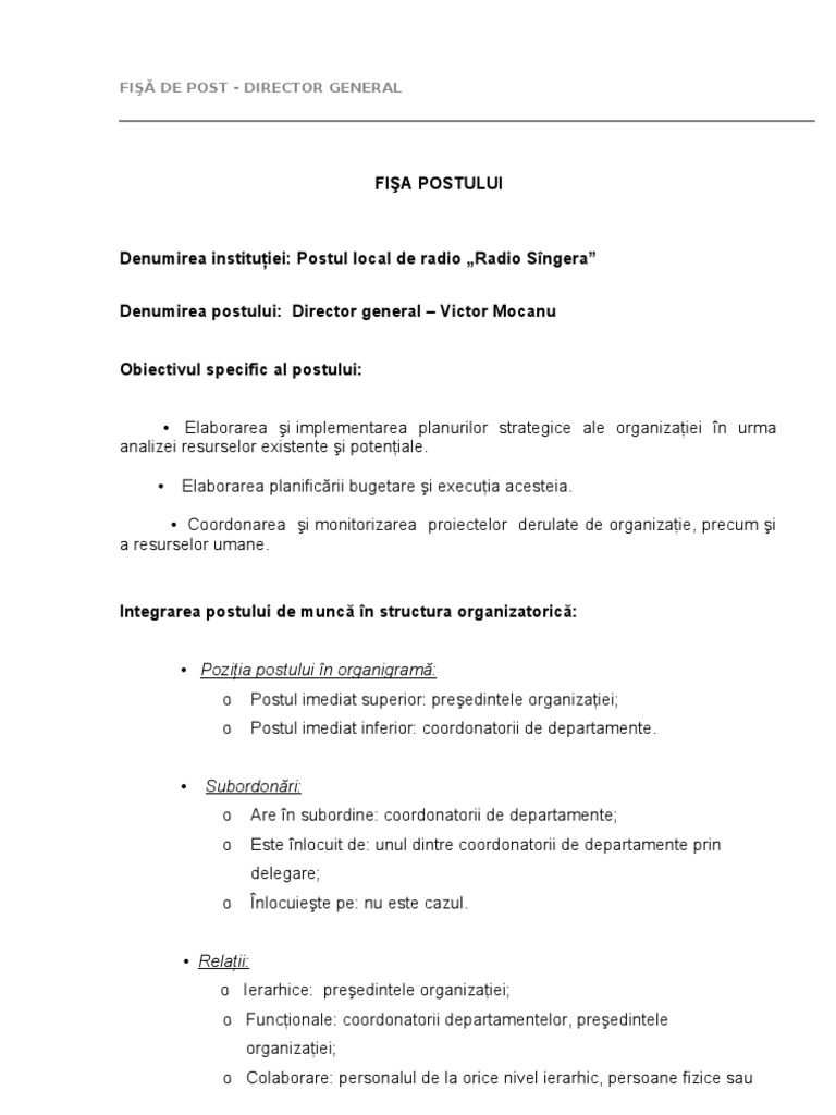 Versiune noua actualizat ianuarie 2019. Director general are in subordine. Va oferim cadou un raport special gratuit 7 modele de fise de post pentru institutiile publice actualizate in 2020. Fișa de post director general model gratuit editabil articol publicat in resurse umane contractul de munca avand ca subiect fise de post citeste mai multe despre contractul de munca fise de post gratuite modele fise de post fisa postului model doc fisa postului model pdf fisa de post manager general fise de post.