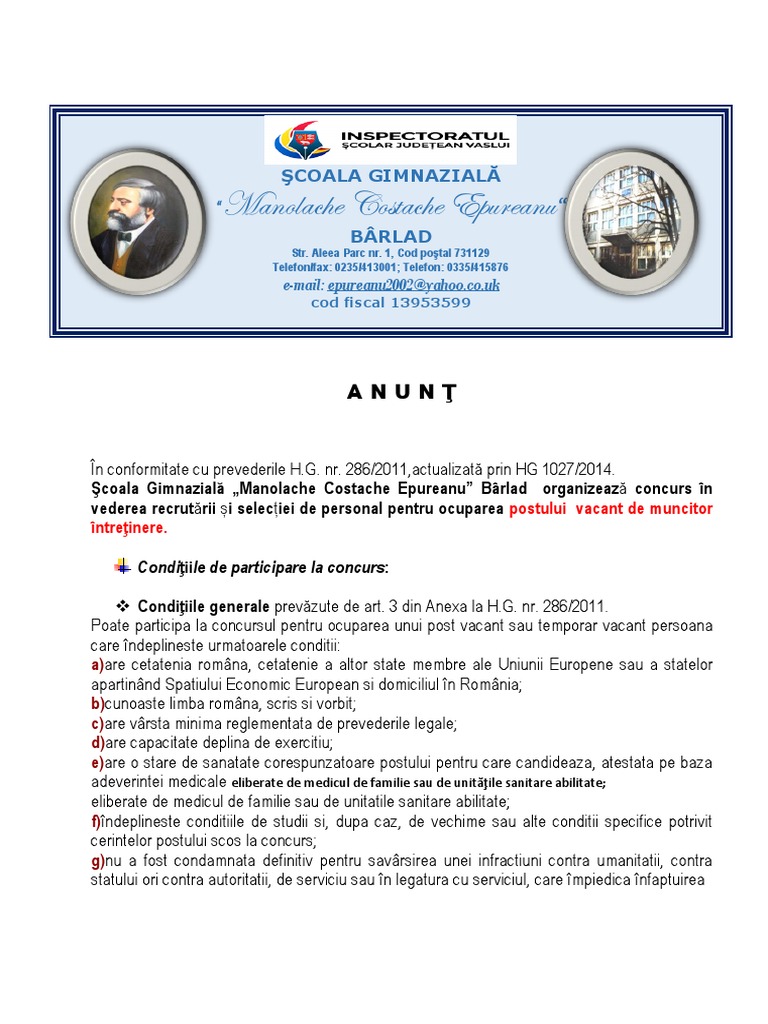 286 2011 pentru aprobarea regulamentului cadru privind stabilirea principiilor generale de ocupare a unui post vacant sau temporar vacant corespunzator functiilor contractuale si a criteriilor de promovare in grade sau trepte profesionale imediat superioare a personalului contractual din sectorul bugetar platit din fonduri publice a fost publicat in monitorul oficial al romaniei partea. Textul publicat in monitorul oficial al romaniei. Actualizata pana la data de 20 aprilie 2016 emitent guvernul in temeiul art. 286 2011 pentru aprobarea regulamentului cadru privind stabilirea principiilor generale de ocupare a unui post vacant sau temporar vacant corespunzator functiilor contractuale si a criteriilor de promovare in grade sau trepte profesionale imediat superioare a personalului contractual din sectorul bugetar platit din fonduri publice.