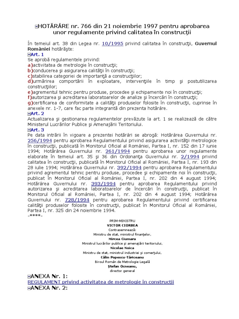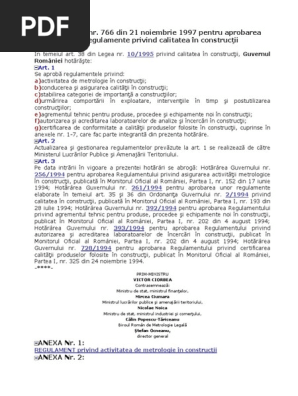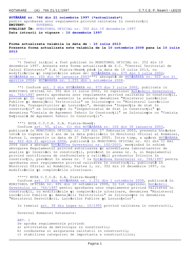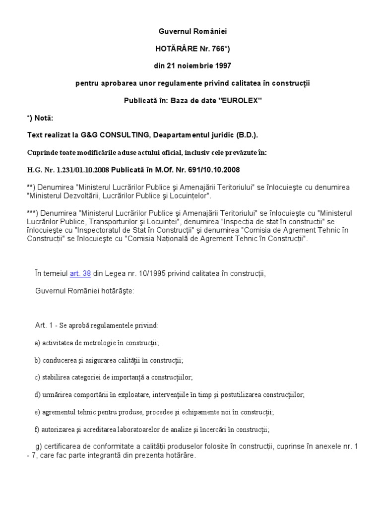 766 1997 pentru aprobarea unor regulamente privind calitatea în construcńii publicată în monitorul oficial al româniei partea i nr. 766 1997 pentru aprobarea unor regulamente privind calitatea în construcţii cu modificările. Hotărârea 766 1997 modificat de hotărârea 750 2017. 1 231 din 1 octombrie 2008 publicată în monitorul oficial nr.