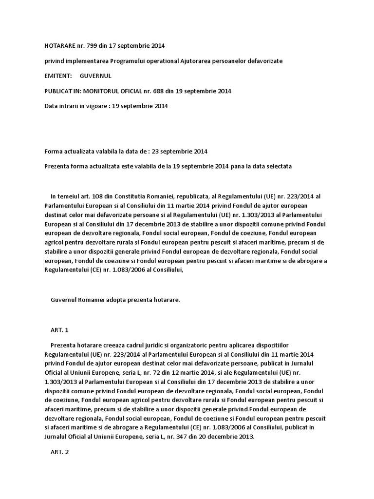 799 2014 privind implementarea programului operaţional ajutorarea persoanelor defavorizate publicată în monitorul oficial al româniei partea i nr. 688 din 19 septembrie 2014 cu completările ulterioare se modifică şi se completează după cum urmează. Vânzarea unor imobile proprietate privată a statului aflate în administrarea regiei autonome. 799 2014 privind implementarea programului operaţional ajutorarea persoanelor defavorizate hg nr.