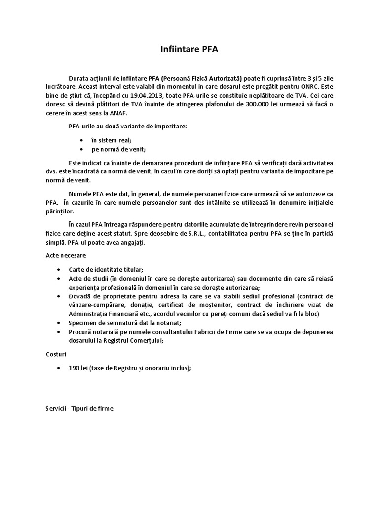 Costurile de infiintarea unei firme pfa sunt mai scazute decat in cazul societatii cu raspundere limitata iar evidenta contabila se tine in partida simpla. Vreti sa infiintati un pfa. Cum infiintezi un pfa pasi documente si acte necesare de cristina popescu september 15 2020 daca vrei sa lucrezi independent sau sa demarezi propriul business este necesara fie infiintarea unei societati de exemplu. Astfel pentru a infiinta un pfa va trebui ca antreprenorul sa gaseasca un sediu social care sa corespunda din punct de vedere sanitar psi si al protectiei mediului.
