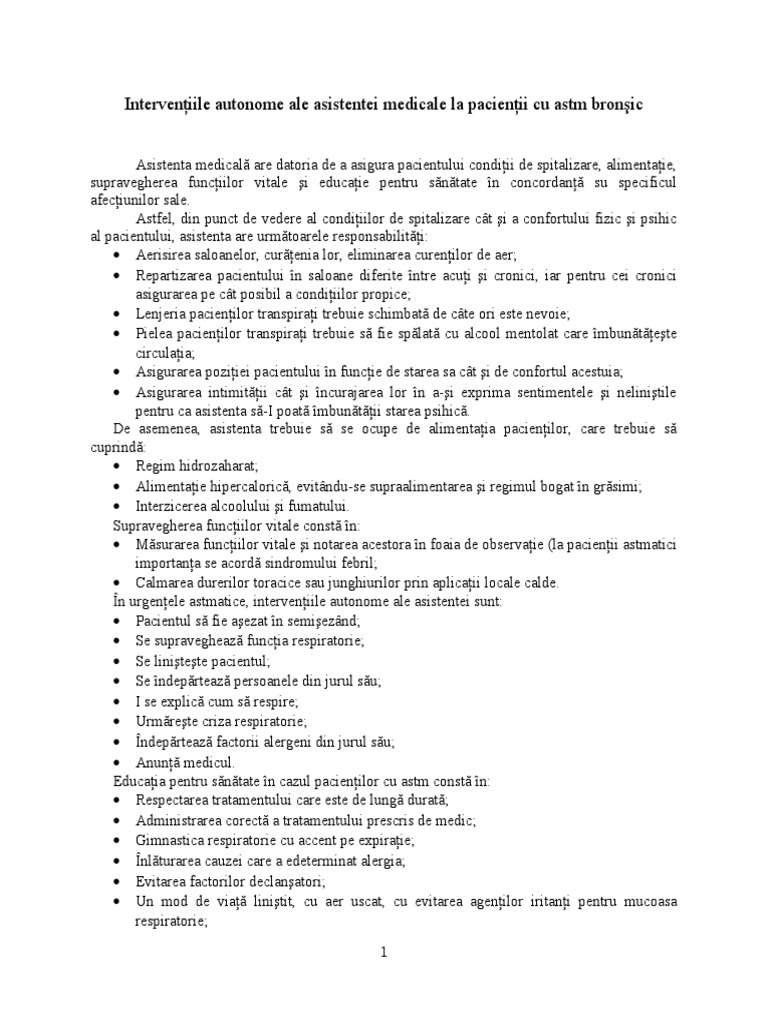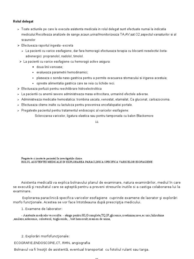 Interventii autonome si delegate ale asistentei medicale. Mobilizrii ct mai precoce pentru prevenirea complicaiilor postoperatorii se urmrete permanent apariia eventualelor semne ale unor complicaii tromboembolitice se ajut. Interventii delegate prescrise de medic si realizate autonom dar si delegat de catre asistentele medicale in cazul carora responsabilitatea revine in principal celui care delega. In orice hemoragie digestiva internarea in spital este obligatorie de obicei intr un serviciu chirurgical. Vindecarea propriu zisa a afectiunii au si scopul de a vindeca in mare masura sufletul.