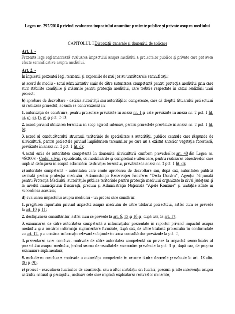 292 din 3 decembrie 2018 privind evaluarea impactului anumitor proiecte publice și private asupra mediului. 110 din 19 mai 2017 publicată în monitorul oficial nr. Capit olul i dispozitii generale art. 292 din 20 decembrie 2011 legea asistenţei sociale emitent.