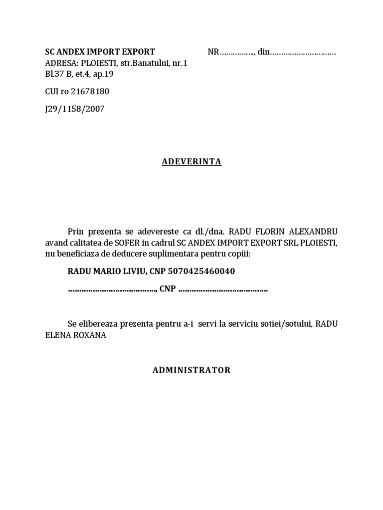 Raspunsul la aceasta intrebare este disponibil doar pentru utilizatorii inregistrati. Persoana mai sus menţionată figurează în evidenţele noastre cu următorii coasiguraţi soţ soţie părinţi aflaţi în întreţinere. Va rog sa mi trimiteti modelul de adeverinta medic pentru anul 2016 pentru salariati. Un model adeverinta salariat poate fi descarcat de pe site ul casei nationale de asigurari de sanatate.