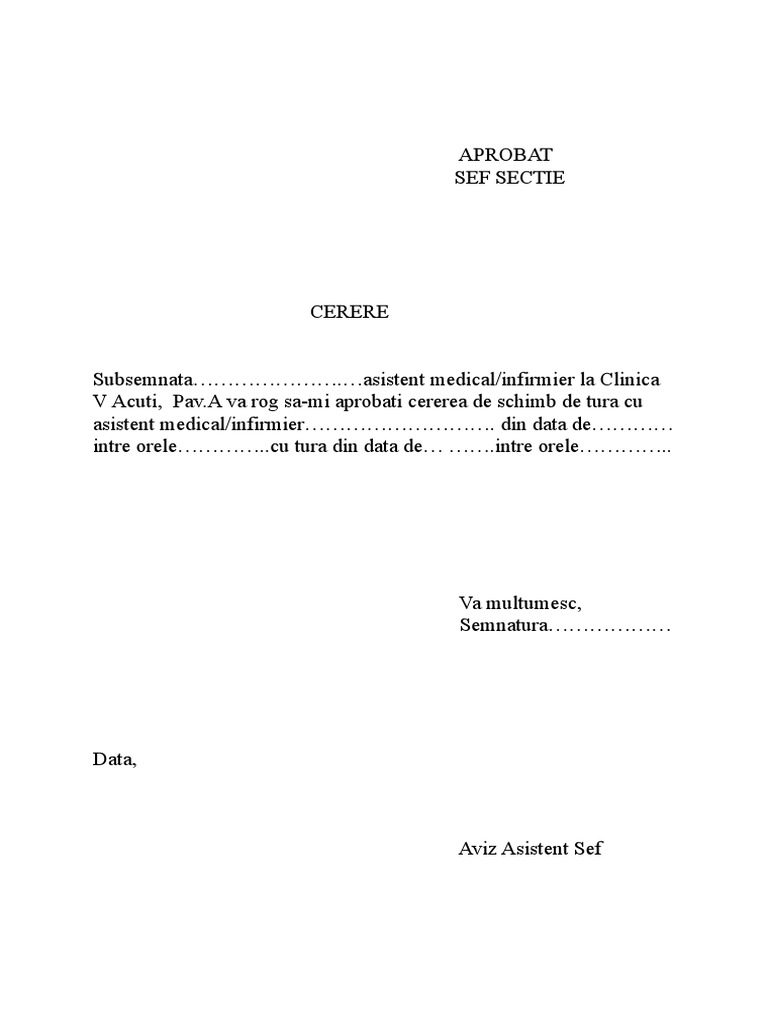 Model cerere invoire aprobat director scoala gimnaziala ziduri prof. Este ideal sa existe o cerere scrisa de invoire care sa fie aprobata de angajator. Se acorda in situatii de urgenta in baza unei cereri de invoire cerere pe care o aproba angajatorul. Asadar in situatia in care salariatul lipseste de la serviciu cu acordul angajatorului acord manifestat prin aprobarea cererii de invoire a salariatului in cauza de catre angajator acesta va fi pontat si pentru orele respective beneficiind in mod corespunzator de salariu.