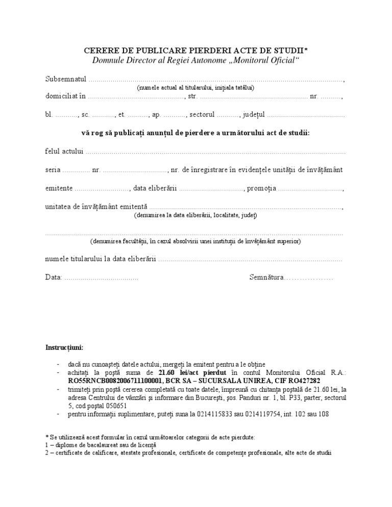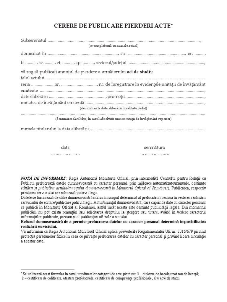Acte necesare schimbarea numelui. începând cu data de 1 02 2017 pentru cererile privind pierderile de acte regia autonomă monitorul oficial nu mai percepe tariful de publicare conform legii nr. 1 2017 privind eliminarea unor taxe și tarife precum și pentru modificarea și completarea unor acte. Publicarea cererii de schimbare a numelui se realizează pe baza unei cereri tip în original cu viza oficiului.