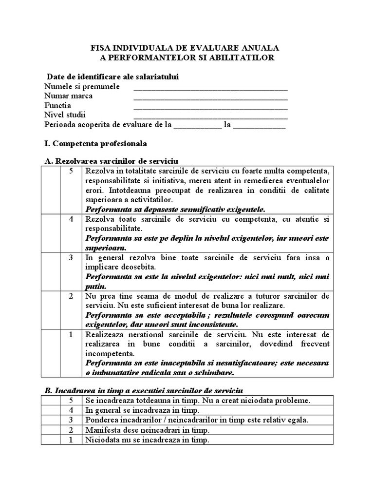 Model fisa de evaluare a performantelor profesionale individuale 2020. In urma evaluarii performantelor profesionale individuale se pot lua masurile necesare pentru imbunatatirea modalitatii de lucru sau recompensarea angajatilor. Prin acest articol venim în sprijinul dvs cu un nou formular privind fișă de evaluare anuală a salariaților. însă literatura de specialitate și practica relevă. Este în format editabil și îl puteți descărca în acest link fișă de evaluare anuală salariați 2019.