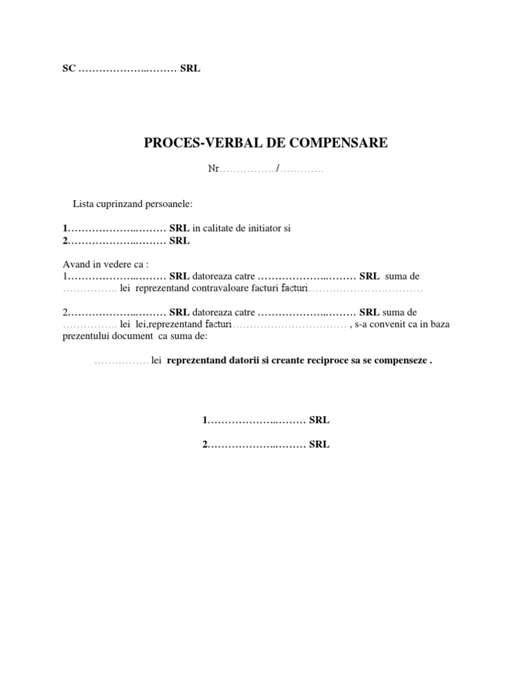 773 2019 pentru aprobarea normelor metodologice privind monitorizarea datoriilor nerambursate la scadenta ale contribuabililor persoane juridice in vederea diminuarii blocajului financiar si a pierderilor din economie prin care se abroga hotararea. 36 intrebari si raspunsuri despre ordin de compensare din 2019 si 2020 conform legislatiei in vigoare clic aici pentru alte articole relevante despre ordin de compensare din arhiva portalcontabilitate ro. Pe verso ul formularului rosu se trec facturile emise de catre agentul initiator. De asemenea de la aceeasi data pentru facturi cu valori mai mari de 10 000 lei compensarea datoriilor neplatite la termenele scadente se va realiza numai in conformitate cu prevederile regulamentului de compensare aprobat prin prezenta hotarare iar pentru suma reprezentand contravaloarea facturilor mai mici de 10 000 lei inclusiv.
