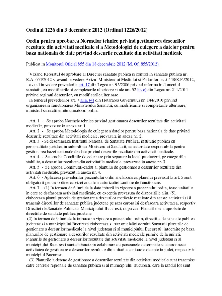 Ordinul 1226 din 3 decembrie 2012 pdf. 1226 2012 din 03 decembrie 2012 ordinul nr. 1226 2012 pentru aprobarea normelor tehnice sulylqgjhvwlrqduhdghúhxuloruuh. 1226 din 3 decembrie 2012 pentru aprobarea din legea nr. Ordinul nr 1226 din 03 12 2012 pentru aprobarea normelor tehnice privind gestionarea deşeurilor rezultate din activităţi medicale şi a metodologiei de culegere a datelor pentru baza naţională de date privind deşeurile rezultate din activităţi medicale act emis de.