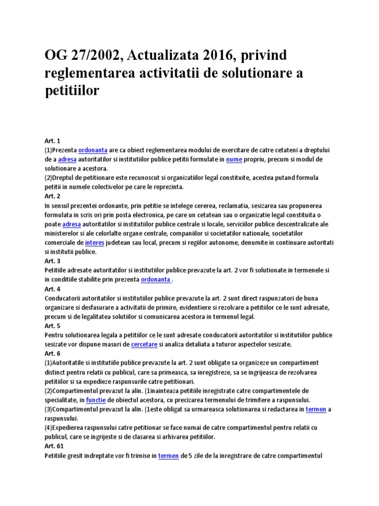 Ordonanta 27 2002 actualizata 2018 pdf. 49 din 18 ianuarie 2018 articolul 10 1 în cazul în care un petiționar adresează aceleiași autorități sau instituții publice mai multe petiții sesizând aceeași problemă acestea se vor. Guvernul data intrarii in vigoare. La 21 01 2018 articolul 9 a fost modificat de articolul unic din legea nr. 31 din 15 ianuarie 2018 publicată în monitorul oficial nr.