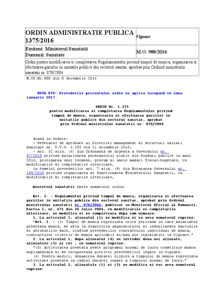 671 din 26 iulie 2004 cu modificarile si completarile ulterioare se modifica si se completeaza dupa cum urmeaza. Acesta este un fragment din regulamentul privind timpul de muncă organizarea și efectuarea gărzilor în unitățile publice din sectorul sanitar din 01 07 2004. Numarul de zile in care isi desfasoara. 870 2004 publicat in monitorul oficial al romaniei partea i nr.