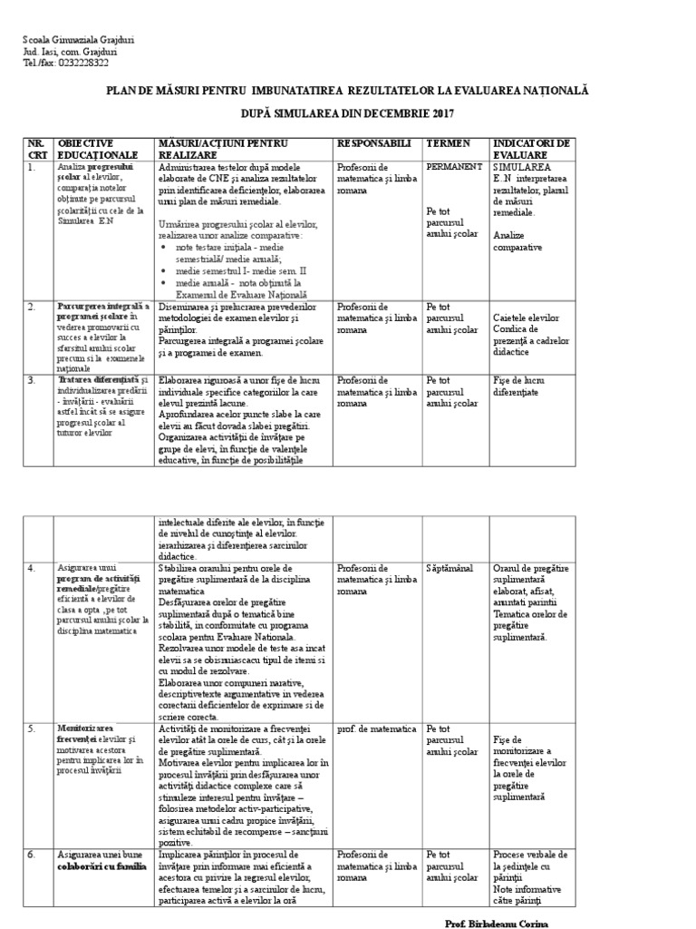 Plan De Masuri Pentru Imbunatatirea Rezultatelor La Evaluarea Nationala