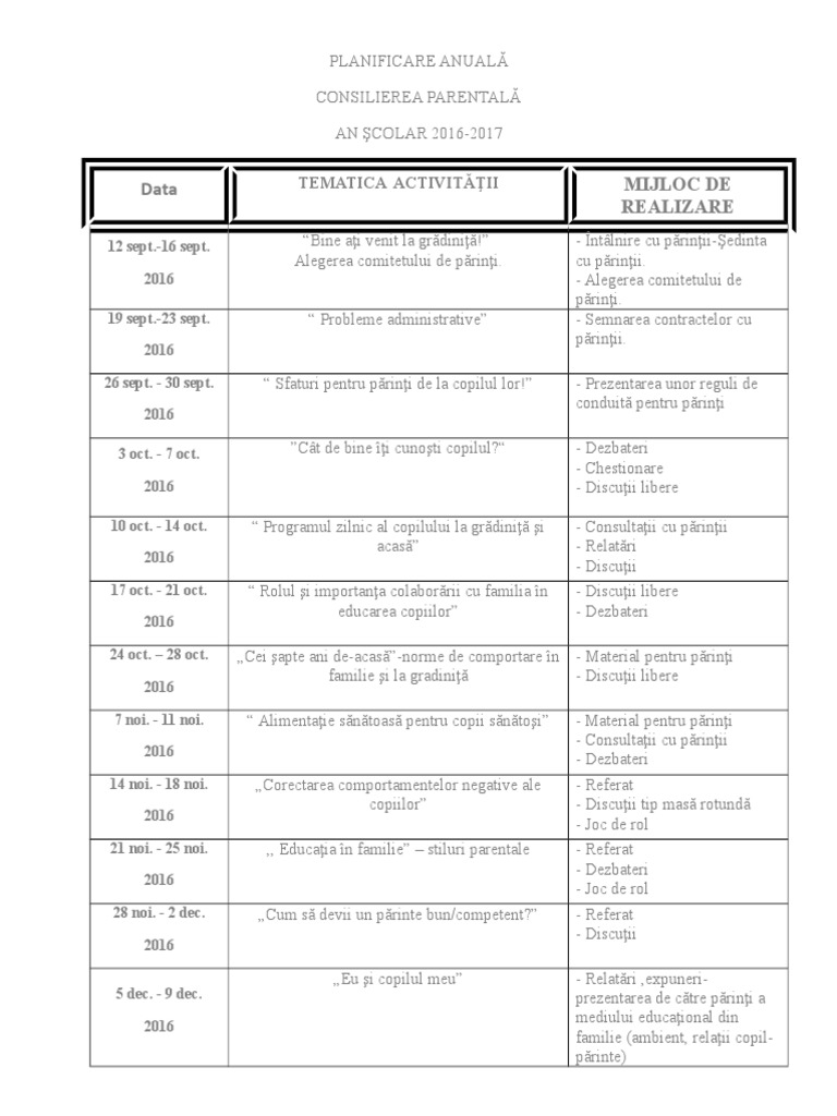 Consiliere copii si parinti planificare. Lucrarea își propune sa fie un sprijin atât pentru cadrele didactice din grădiniță cât și pentru părinți prin cele 40 de teme sugerate menite sa fie dezbătute în ședințele de consiliere parentală și nu numai pentru dezvoltarea unei relații eficiente părinți copii educator. Planificarea activităților de consiliere a părinților copiilor grupei mari albinuțele an școlar 2016 2017 educatoare. 0 stele 0 review uri.