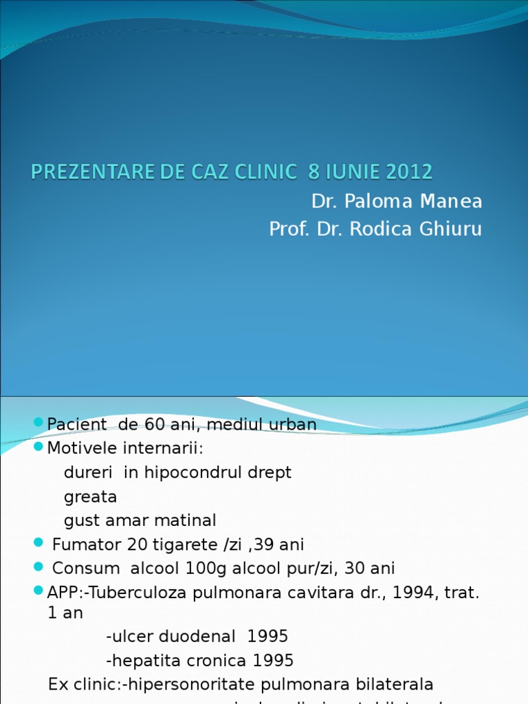 Prezentare caz clinic gastroenterologie. Alexandru padineanu 24 quiz 6. Andrei popescu 22 prezentare caz 4. Hemograma cu examenul citologic examenul morfologic şi histopatologic al măduvei osoase studiul citogenetic şi testele de biologie moleculară. Mediul rural sex masculin varsta 49 ani antecedente personale patologice semnificative 2006 glomerulonefrita mezangio proliferativa cronica nefropatie cu iga 2008 boala renala cronica hipertensiune arteriala secundara 2010 boala renala cronica stadiul 5d hemodializa 3 sedinte sapt 2012 hepatita cronica virala c cardiomiopatie.