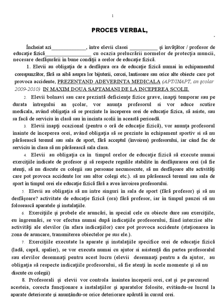 şi elevii claselei cu ocazia prelucrării şi luării la cunoştinţă a regulilor de protecţi a muncii şi de prevenire a accidentelor la orele de educaţie fizică şi activităţi sportive. 16 septembrie 2006 11 21. Prima pagină învăţământ gimnazial educatie fizica si sport diverse proces verbal protectia muncii ed fizica 17 septembrie 2013 11 42 0 stele 0 review uri. Reguli de protecţie a muncii şi de prevenire a accidentelor la orele de educaţie fizică şi activităţi sportive conform repere metodologice efs 2020.