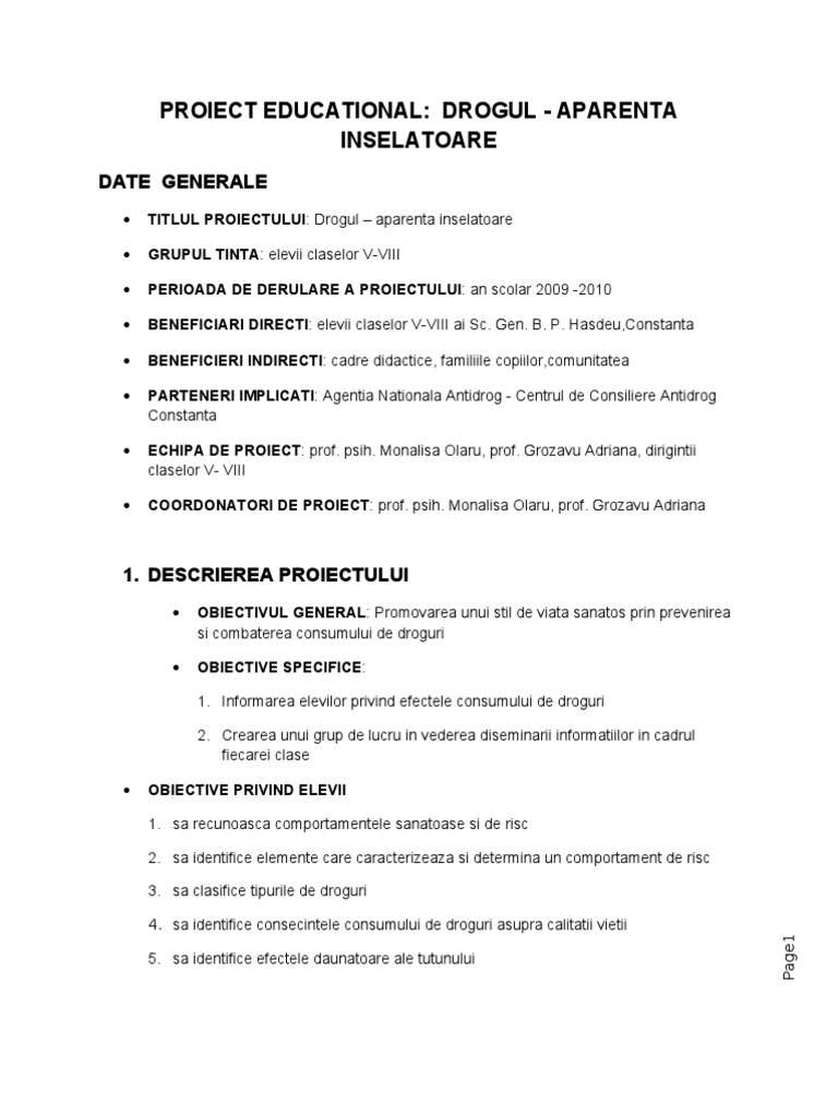 Proiect educational prevenirea consumului de droguri. Proiect de prevenire a consumului de droguri an școlar 2016 2017 coordonatori proiect. Profesor indrumator prezentat profesorului. Scopul proiectului este prevenirea consumului de tutun alcool şi droguri ilegale în rândul adolescenţilor în sensul scăderii acestuia şi sau întârzierii debutului în consum şi a tranziţiei de la consumul experimental de droguri la cel regulat prin participarea a 21 de consilieri şcolari la cursul de formare în cadrul. Mediul educational scolar este prin definitie un promotor al idealurilor societatii al carui produs este.