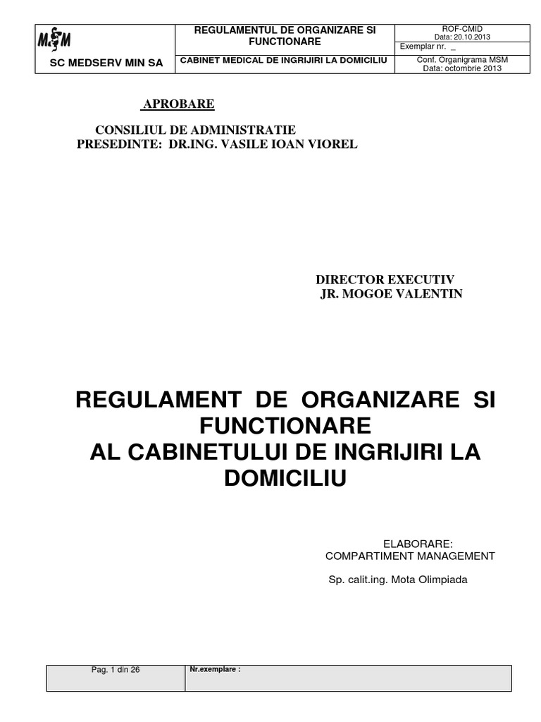 Regulament de organizare si functionare srl medical. 87 2006 privind asigurarea calităţii în educaţie acte normative în vigoare elaborate de. Rof scoged editia. Regulamentul de organizare si functionare rof pentru srl este un instrument de conducere care descrie structura unei organizatii prezentand pe diferitele ei componente atributii competente niveluri de autoritate responsabilitati mecanisme de relatii. 319 2006 privind securitatea si sanatatea in munca legea nr.