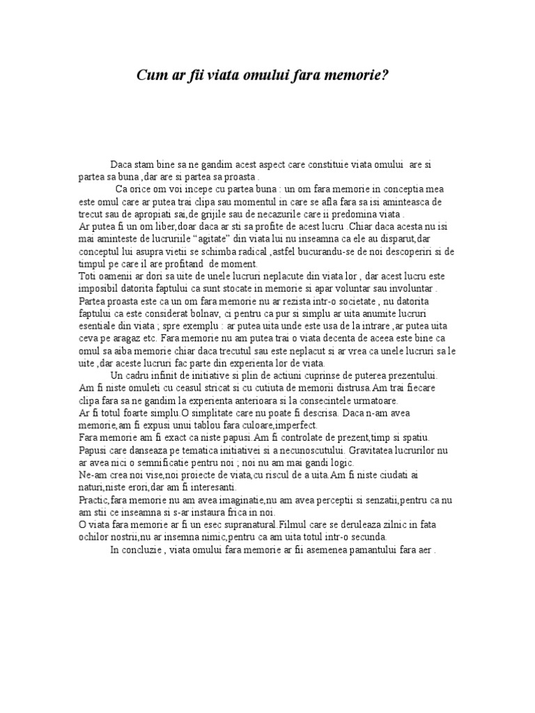 Rolul memoriei in viata psihicã memoria se vadeste a fi un sistem hipercomplex organizat in mai multe structuri interdependente. Si nu doar din acel moment de exemplu un om care nu are memorie nu isi aduce aminte de greseala facuta cu ceva timp in urma si o repeta. Memorie autobiografica memorie pentru evenimente speciale din propria viață este privită în general fie ca echivalent sau un înlocuitor al memoriei episodice. Ca orice om voi incepe cu partea buna un om fara memorie in conceptia mea este omul care ar putea trai clipa sau momentul in care se afla fara sa isi aminteasca de trecut sau de apropiati sai de grijile sau de necazurile care ii predomina viata ar putea fi.