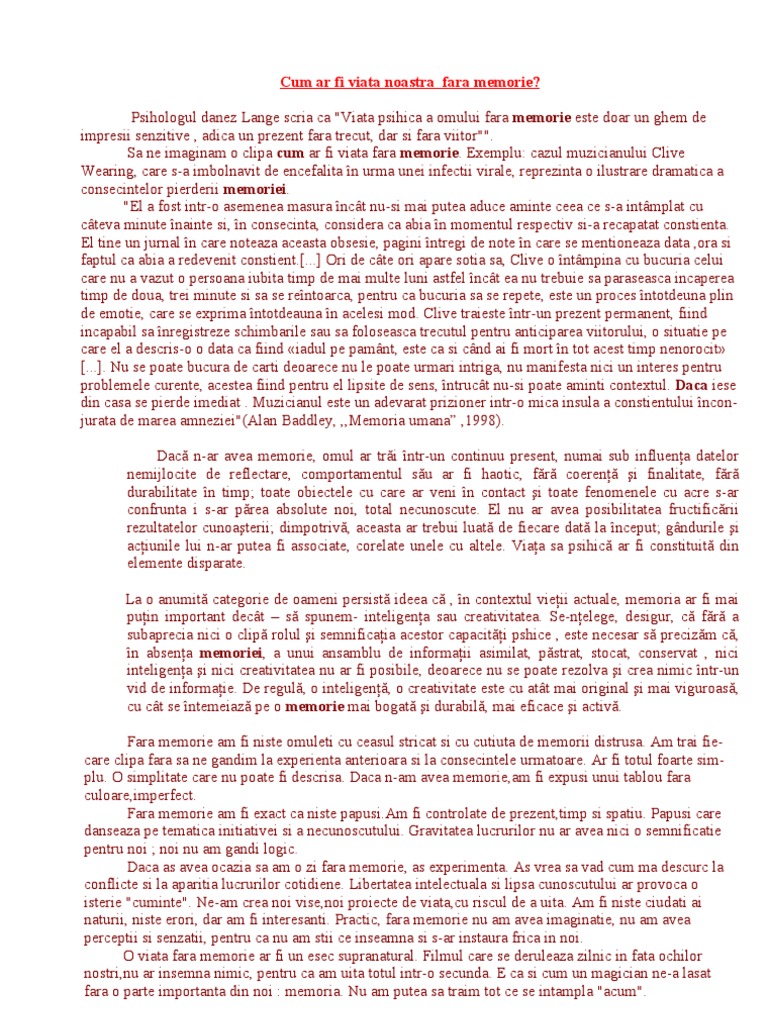 Rolul memoriei in viata omului. Viata psihica a omului fara memorie este doar un ghem de impresii senzitive adica un prezent fara trecut dar si fara viitor psiholog lange memoria poate fi definita ca proces psihic de intiparire stocare si reactualizare a informatiei mecanism psihic structurant constructiv chiar creativ. Psihologul danez lange scria ca viata psihica a omului fara memorie este doar un ghem de impresii senzitive adica un prezent fara trecut dar si fara viitor. Despre memorie mai putem spune ca se afla în strânsa interactiune si independenta cu toate celelalte procese insusiri si capacitati psihice a individului. Memoriei episodice pe de altă parte este folosita pentru mai multe amintiri personale cum ar fi senzațiile emoțiile și asociațiile personale ale unui anumit loc sau timp.