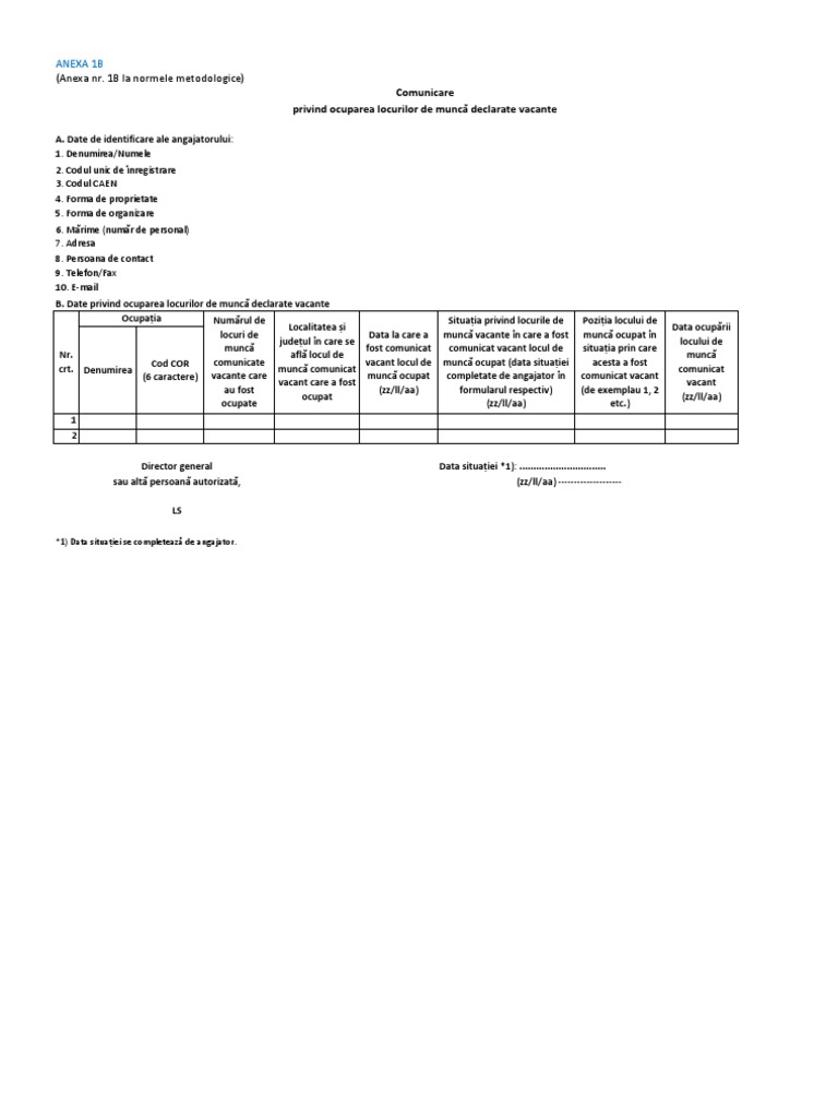 Date privind ocuparea locurilor de muncă declarate vacante nr crt. 1a la normele metodologice de aplicare a legii 76 2002 cu modificarile si completarile ulterioare s a modificat inca din anul 2014 insa avand in vedere anuntul oficial anofm postat de noi anterior detalii aici ne am gandit sa vi l readucem in atentie. 1b la normele metodologice comunicare privind ocuparea locurilor de muncă declarate vacante a. Anexa 1b anexa nr.