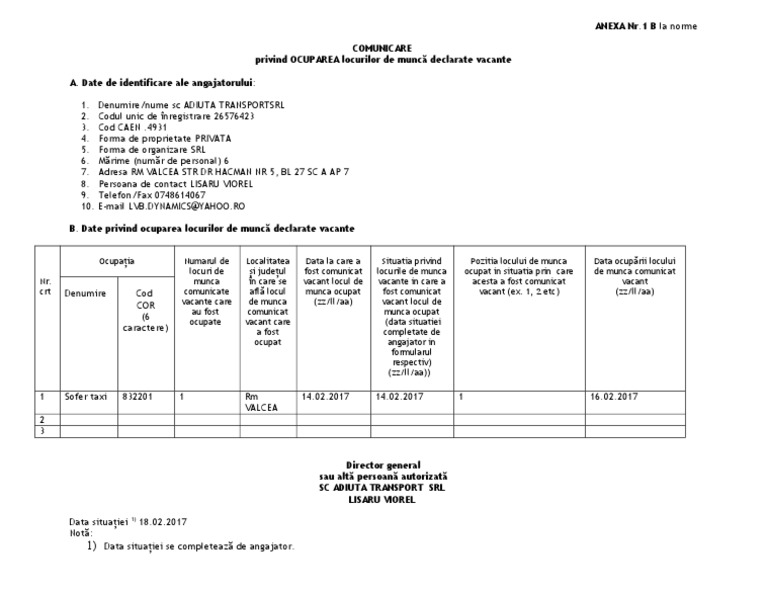 Situatia Privind Locurile De Munca Vacante Anexa 1b