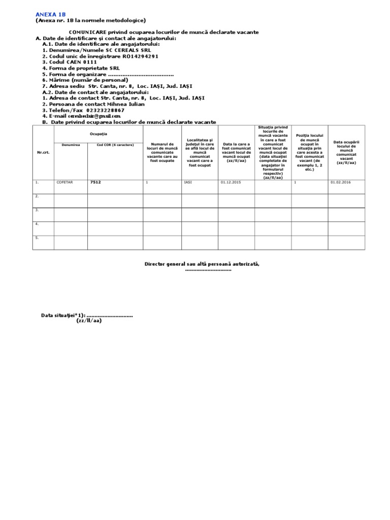 Situatia privind locurile de munca vacante anexa 1b. Date privind locurile de muncă vacante. Ocupaţia numarul de locuri de muncă comunicate vacante care au fost ocupate localitatea şi judeţul în care se află locul de muncă comunicat vacant care a fost ocupat data la care a fost comunicat vacant locul de muncă ocupat zz ll aa situaţia privind locurile de. Date de identificare ale angajatorului. 1a la normele metodologice situaţia privind locurile de muncă vacante.