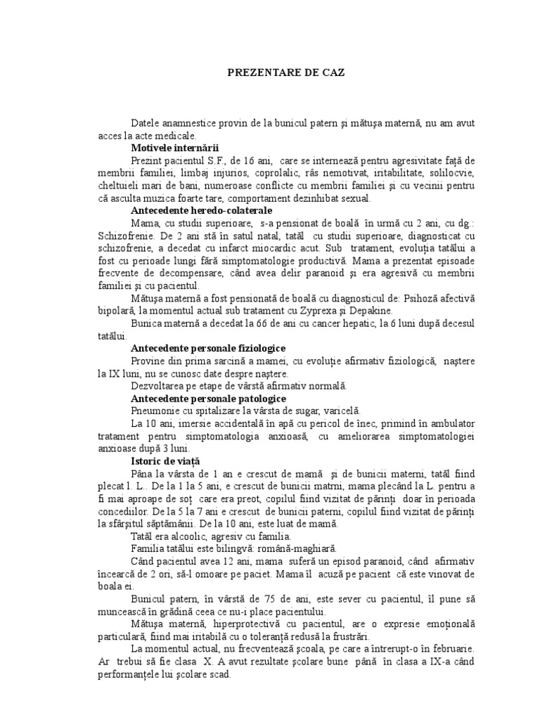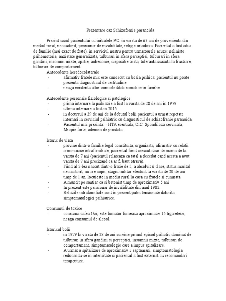 Studiu de caz schizofrenie. Ingrijirea pacientului cu tulburari bipolare. Grimasele farsele si chicotelile sunt specifice acestora. Prezentări de caz dificultăți de diagnostic și tratament în schizofrenia hebefrenică bullet roxana ferezan și colab. Arhiva contine 1 fisier docx de 13 pagini.