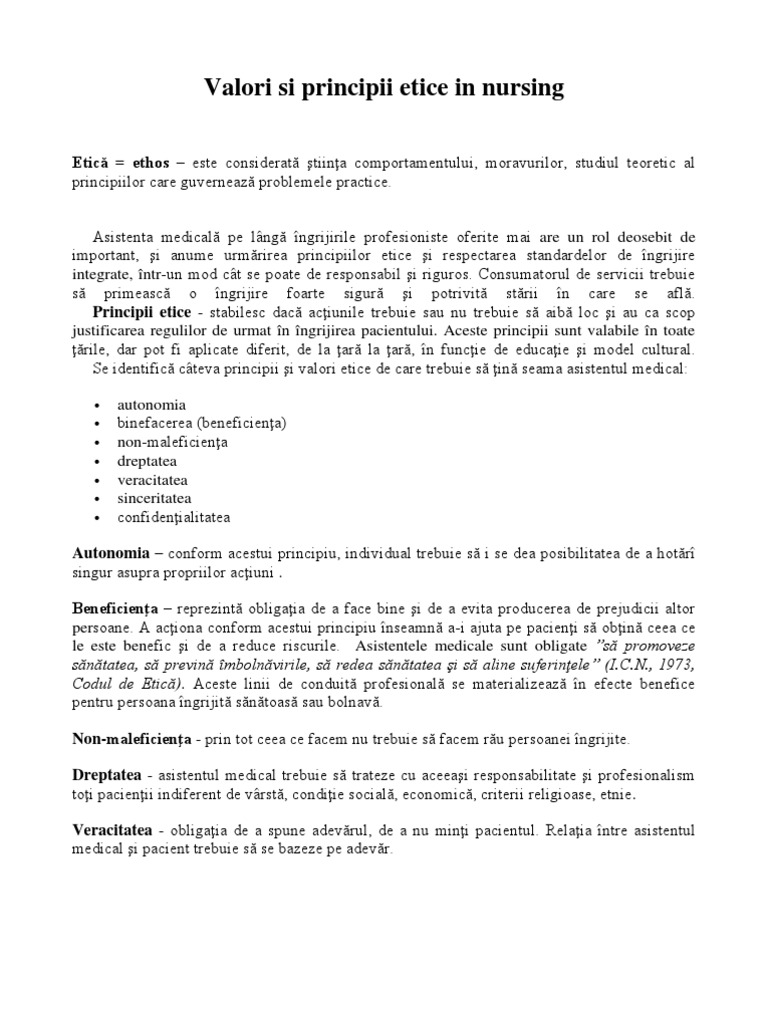 Valori si principii etice in nursing. Valorile reprezinta expresia unor preferinte şi credinte colective dar şi a unor orientari fundamentale şi principii generale. Uita te mai jos si o sa gasesti cele mai relevante rezultate pentru cautarea valori si principii etice in nursing. Academia edu is a platform for academics to share research papers. Valorile și principiile codurilor etice deontologice sau de conduita 1 binele și raul moralul și imoralul sunt principii care definesc obiectul eticii in comportament și in atitudine etica operand cu valori sociale unanim recunoscute iar codurile de etica cu valori ce se circumscriu unor anumite categorii și segmente socio profesionale.